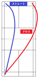 ストレートへのクリアーとクロスへのクリアーでは同じ高さで奥まで打てている場合、滞空時間が異なります。